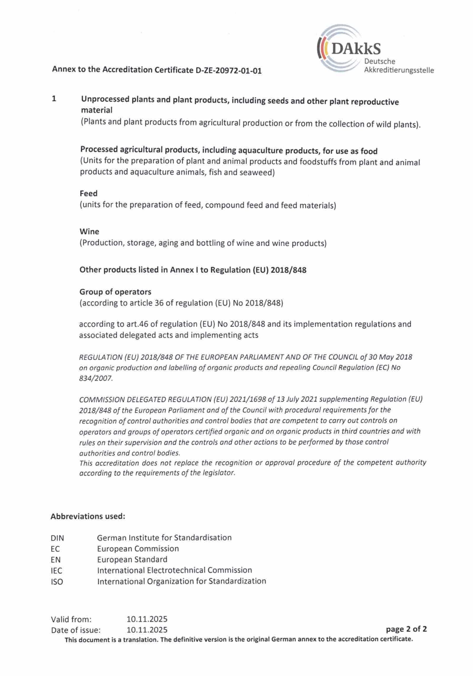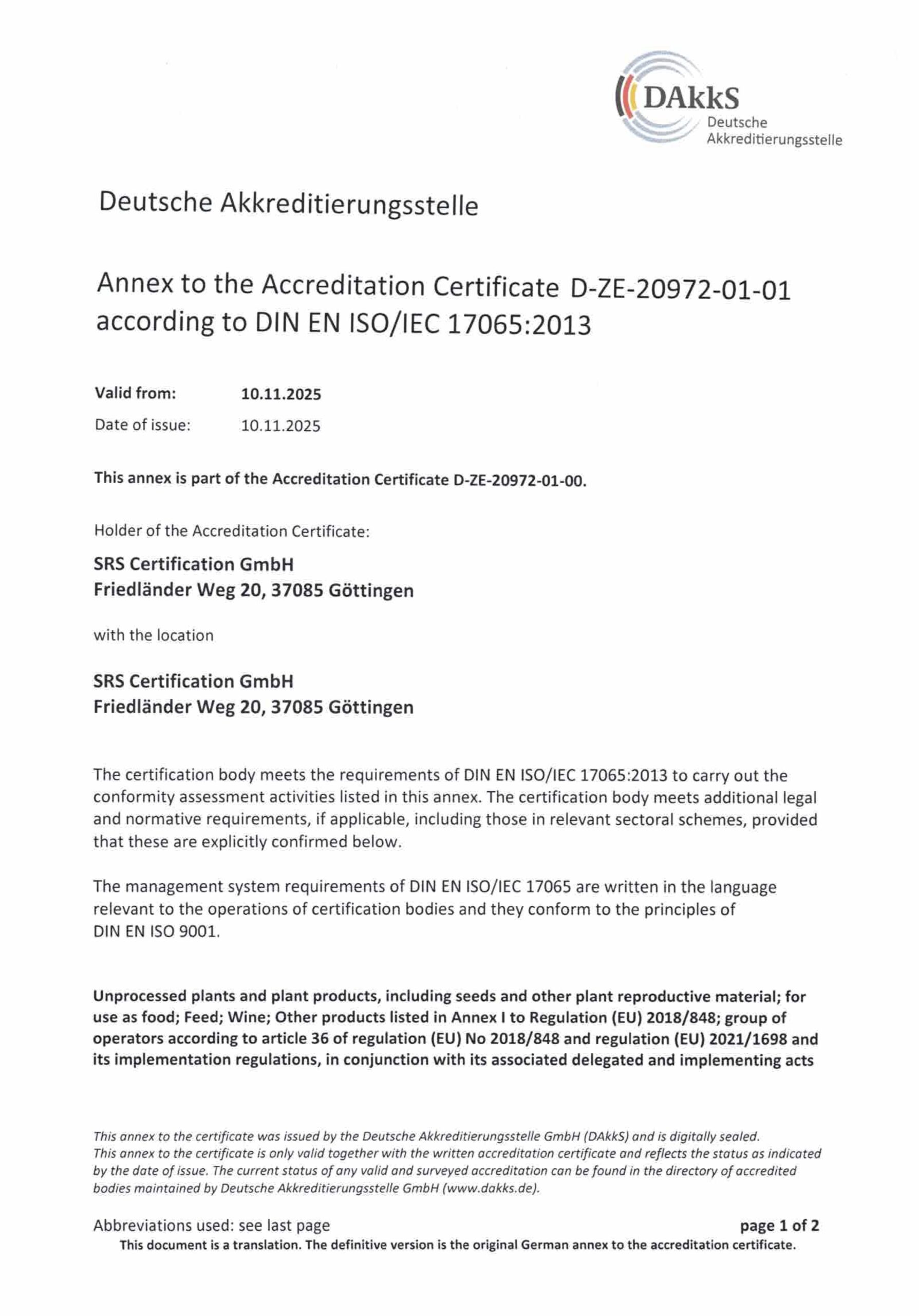 SRS Certification GmbH is currently accredited by DAkkS under ISO/IEC 17065:2012 for organic product certification.