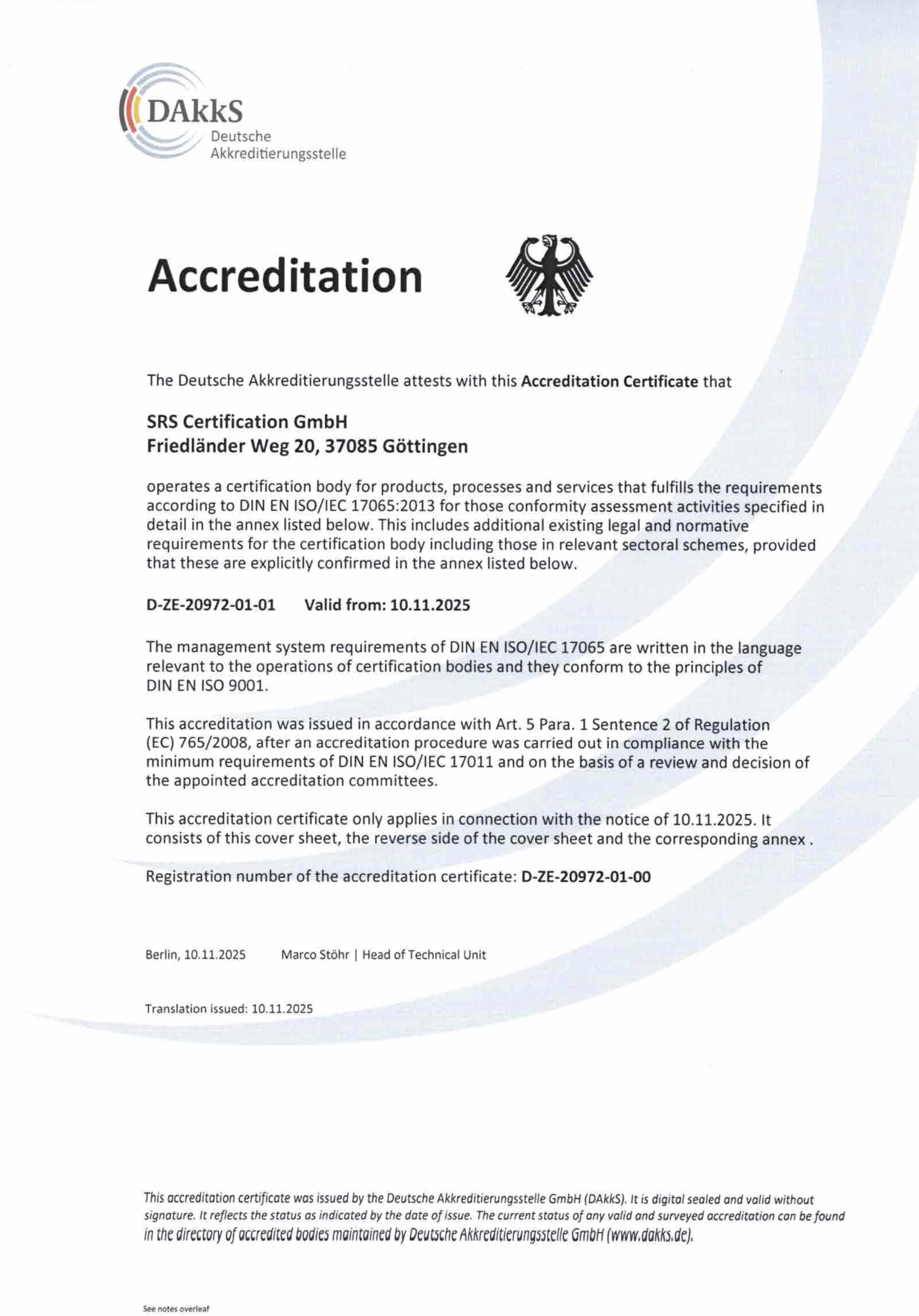 SRS Certification GmbH cũng được công nhận bởi DAkkS và được công nhận bởi DEFRA (Department for Environment, Food & Rural Affairs) for export to Great Britain.